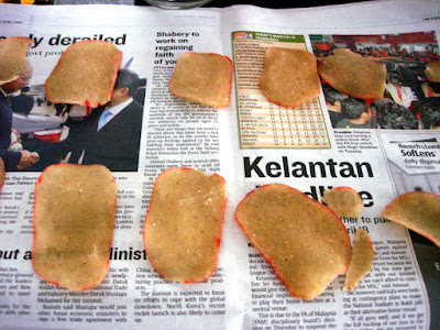 1st i need to open the packet and line the keropoks on newspaper for it to go under the sun to " bengkang" for a while